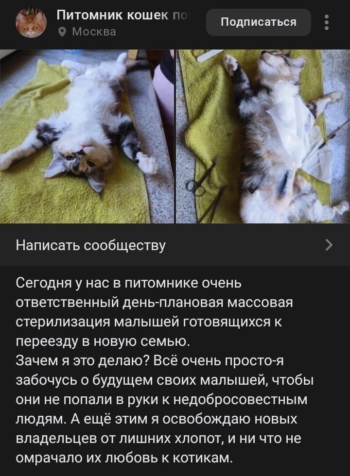 • Личный ветеринар. У многих заводчиков, да и у меня тоже есть «любимые» ветеринары. Это не плохо, это даже хорошо! Но! Далеко не все ветеринары хорошие, а многие творят откровенную дичь. Я много раз встречал случаи в сети, когда личный ветеринар больше напоминает живодера из 90-х, как пример многие проводят полостные операции прямо на кухне. Лапки к столешнице примотают, и айда «в полевых условиях» резать твое будущее животное. Я такого вообще не приемлю, совсем! К примеру для своих котиков я выбираю лучших специалистов, а если нужно провести операцию, то это проводится в хорошей операционной, оснащенной, с привлечением анестезиолога, с предварительным обследованием у кардиолога, с допуском у анестезиолога и т.д. Да, это не дешево выходит, но для своих котиков я выбираю лучшее. И абсолютно точно не выбираю так как показано на картинке! Волосы порой дыбом встают в самых неприличных местах, когда речь заходит о личном ветеринаре заводчика. К счастью такое не у всех, но распространено даже сегодня. На фото это что? Это даже не стол, это полевая ветеринария на подоконнике?!