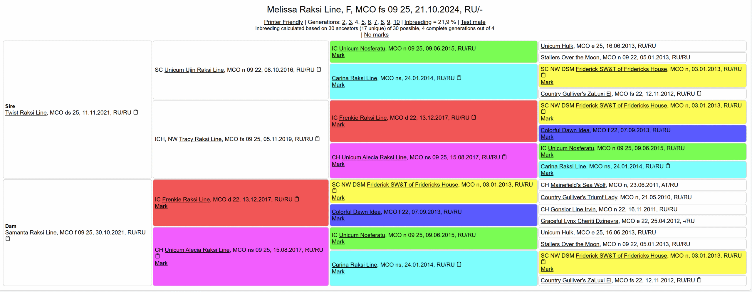 - Я не эксперт, но то, что я увидел в родословной мне понравилось: много колен тотально титулованных предков по FIFe и WCF. Да, процент инбридинга по родословной не нулевой, но уверен на все 100%, что Алла понимает что делает, и у нас не будет проблем с этим. Я не увидел в родословной “левых” питомников, в принципе большинство из них мне знакомо. На мой взгляд родушка выглядит хорошо. Приятно то что Алла добавляет свои родословные на pawpeds, за это ей прям “плюс в карму” 😊Родушку можно оценить сразу, еще до момента разговора о покупке.