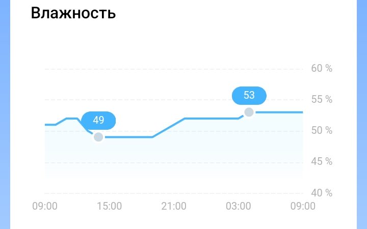 Чем выше разница температур на улице и дома, тем активнее увлажнители испаряют воду. По опыту прошлой зимы могу сказать, что пока температура на улице не очень низкая, одной заправки баков хватает где-то на сутки. Если на улице мороз, то приходится по полтора-два раза за сутки доливать воду. Так-же активность испарения зависит от проветривания помещений. Они автоматически регулируют расход воды, поддерживая целевую влажность. Плюс-минус выходит адекватно… Вот к примеру график влажности из одной комнаты за сутки.